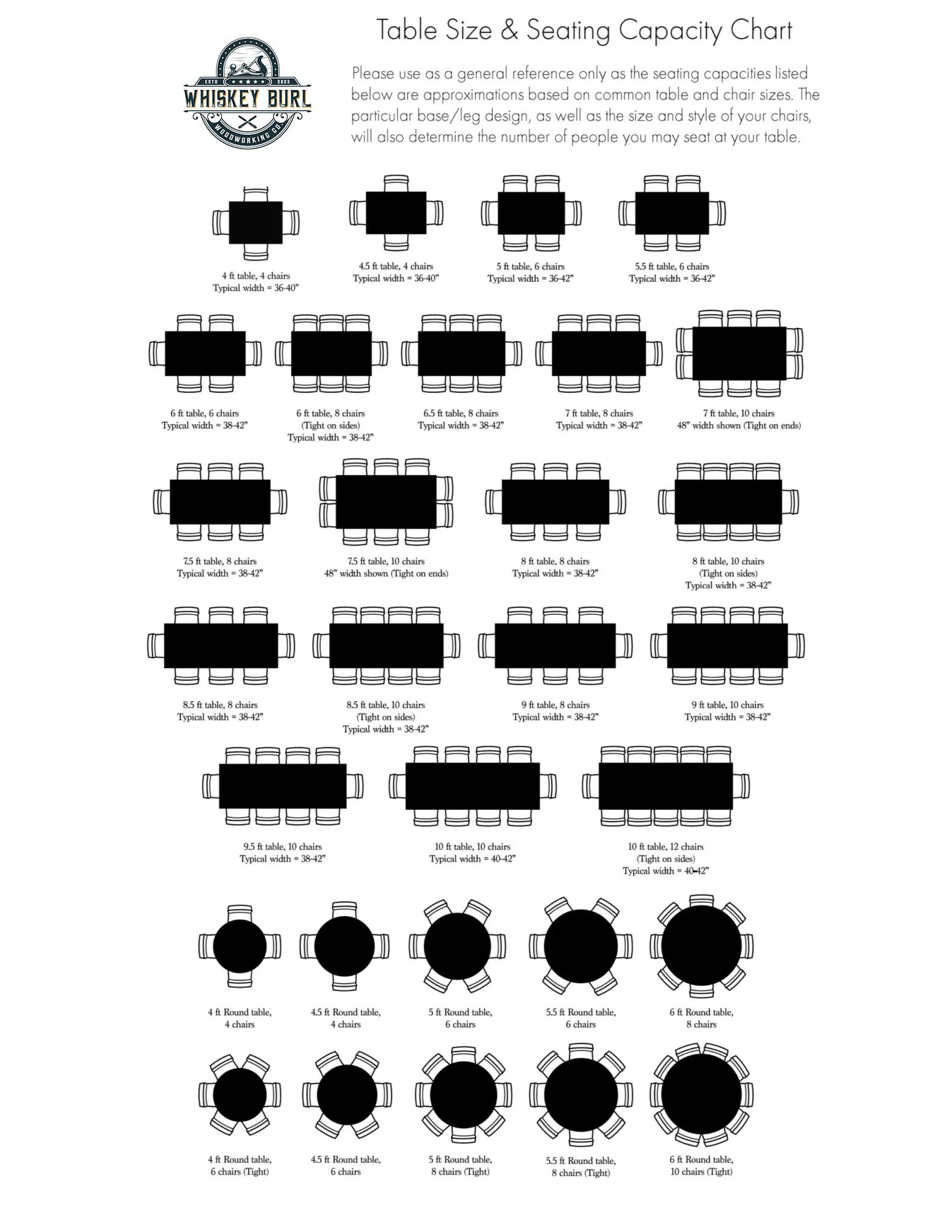 Table size and seating capacity chart for rectangular and round tables, showing various configurations from 4 to 12 chairs, with typical widths of 36 to 42 inches.